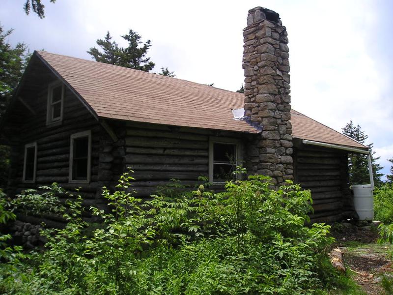 The backside of the cabin. The only water source we could find around here was the collected rain water in the big white barrel.